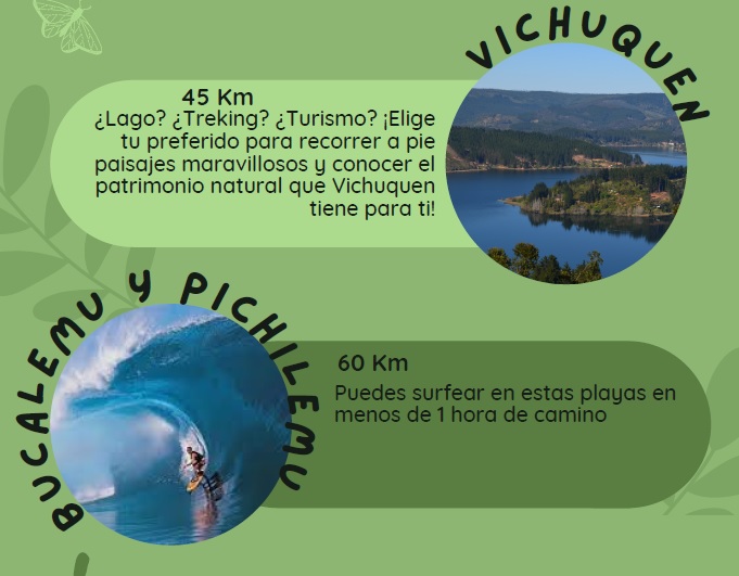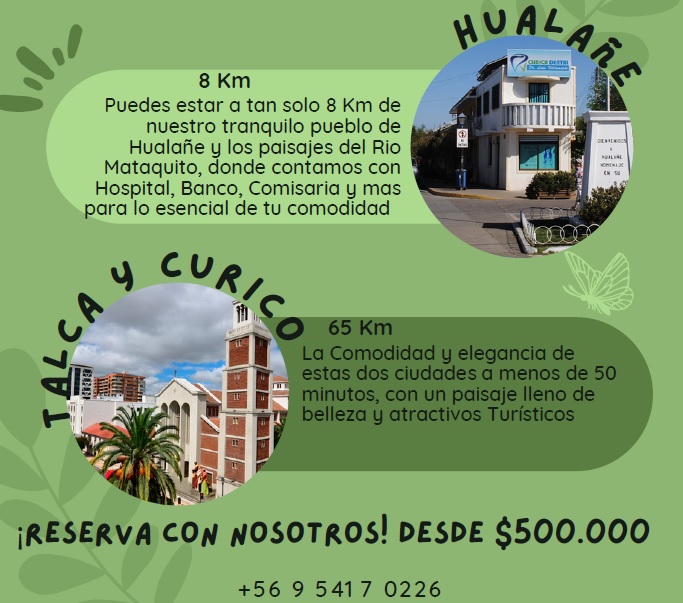 -.Puedes estar a tan solo 8 Km de nuestro tranquilo pueblo de Hualañe y los paisajes del Rio Mataquito, donde contamos conHospital, Banco, Comisaria y mas para lo esencial de tu comodidad.